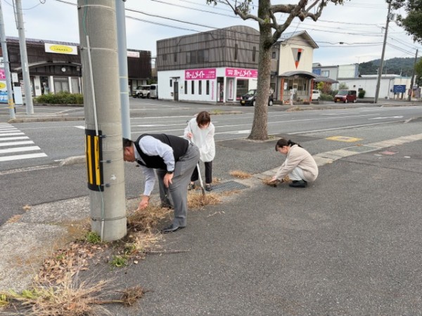 代理店敷地内だけでなく、その周りの公道の草取りなど代表たちと従業員一丸となって、皆、楽しみながら清掃をし、少しでも街を綺麗にするため、貢献するために活動をしました。